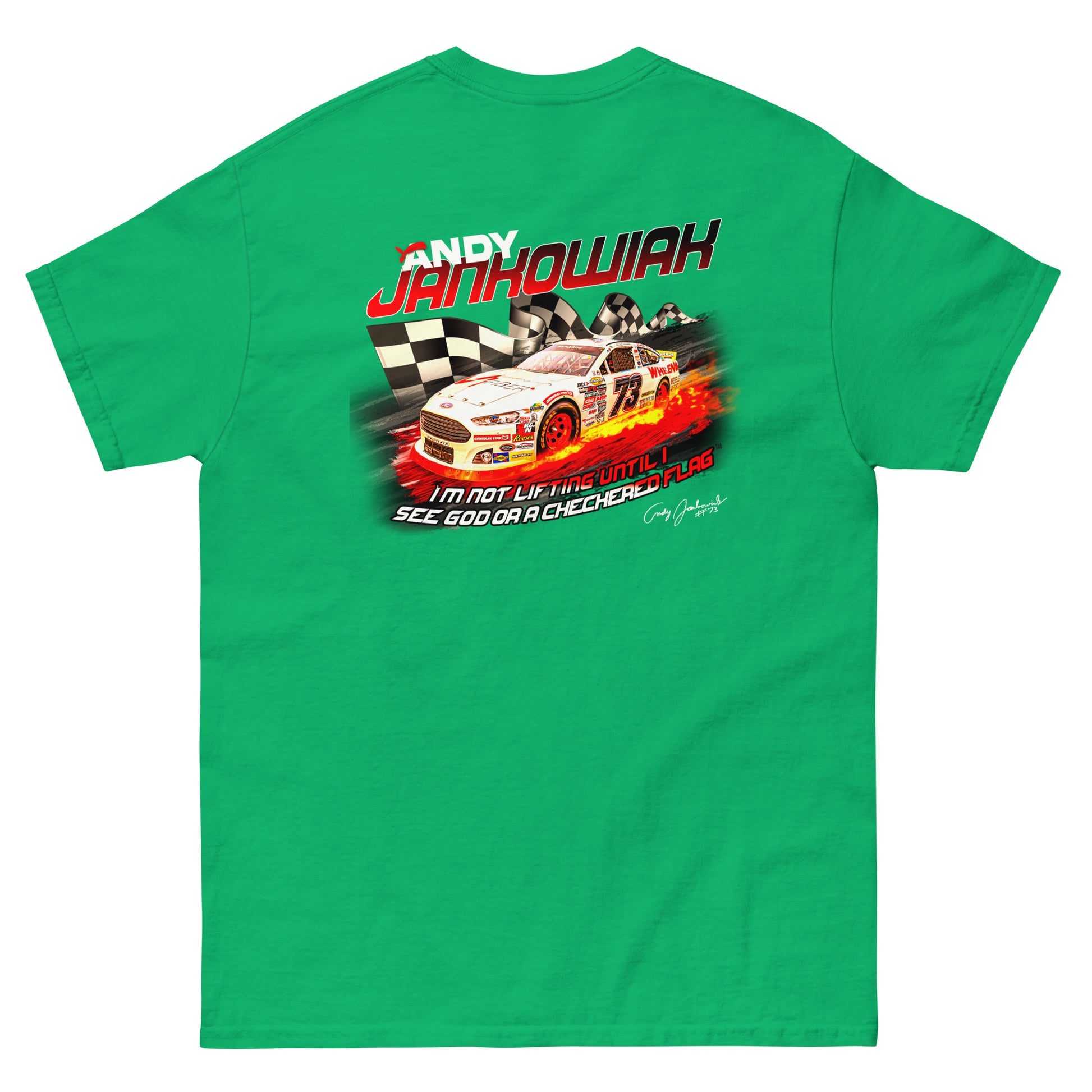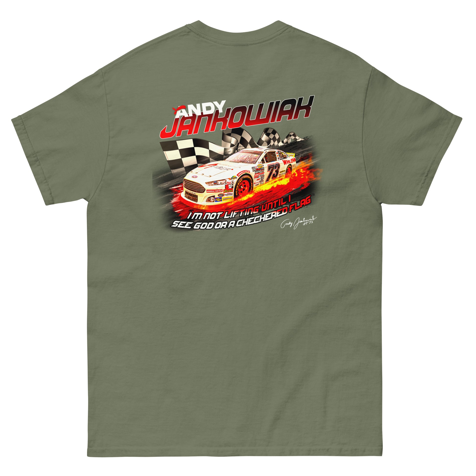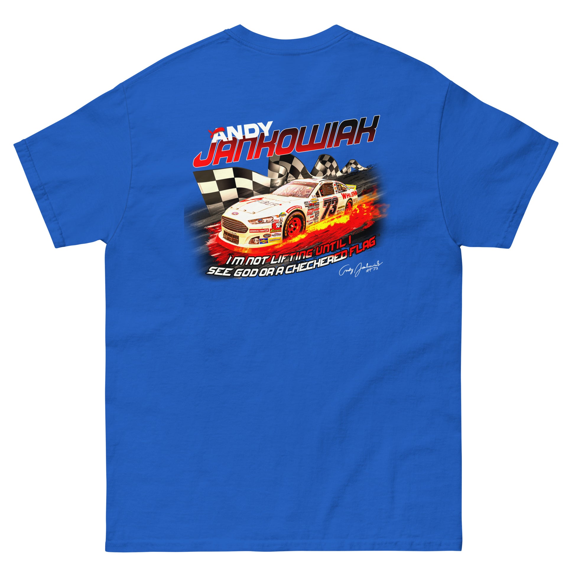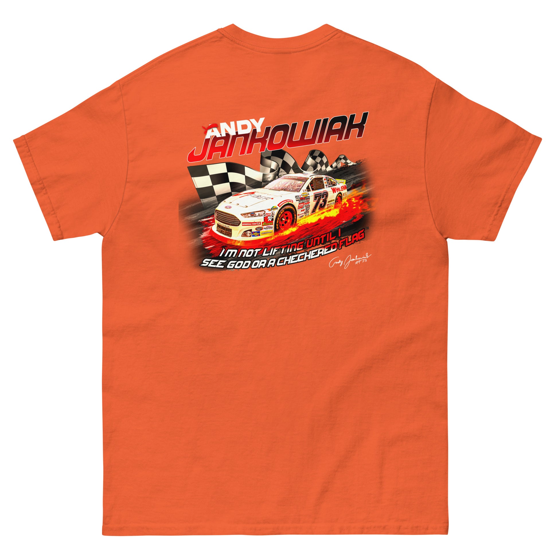 Featuring Andy's iconic quote during the Daytona 2024 race. "I'm not lifting until I see God or the checkered flag"™. The 100% cotton men's classic tee will help you land a more structured look. It sits nicely, maintains sharp lines around the edges, and goes perfectly with layered streetwear outfits. Plus, it's extra trendy now!