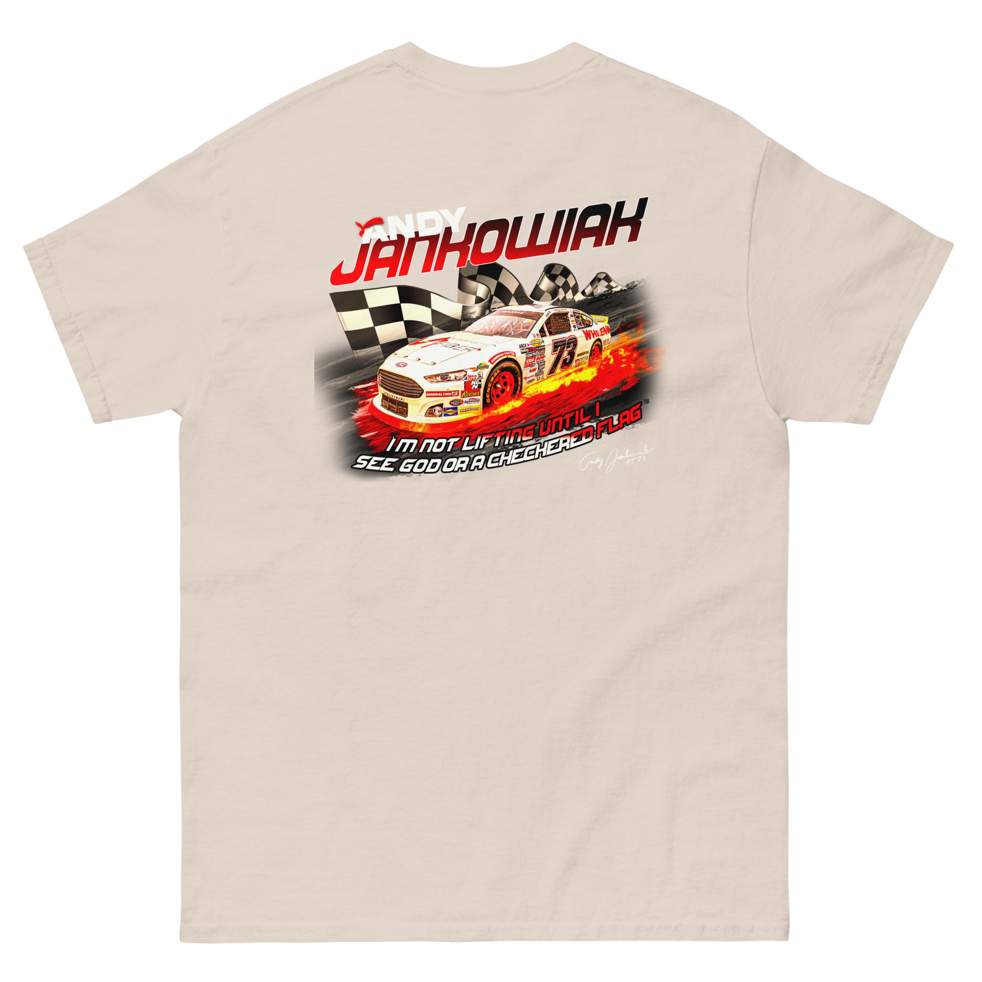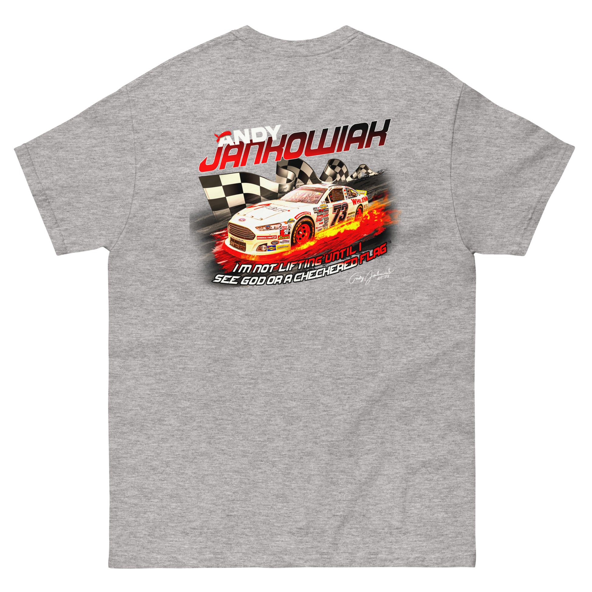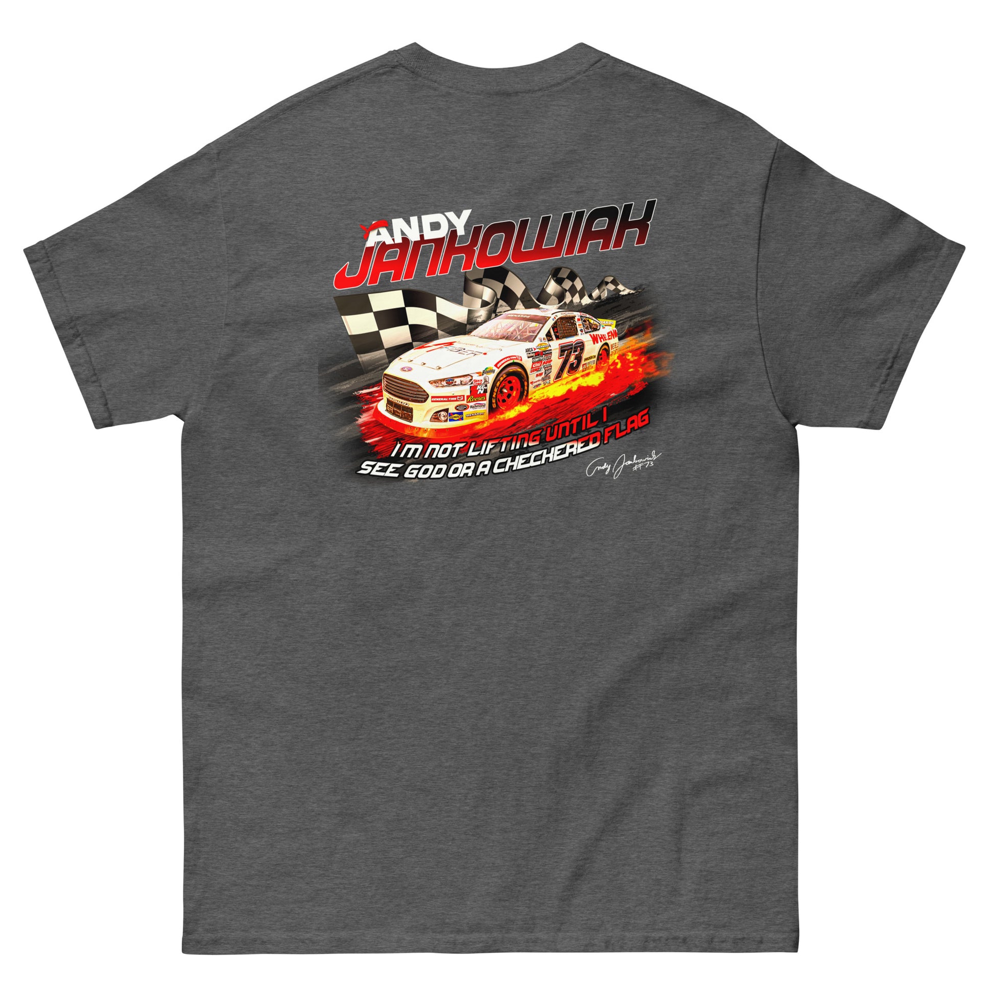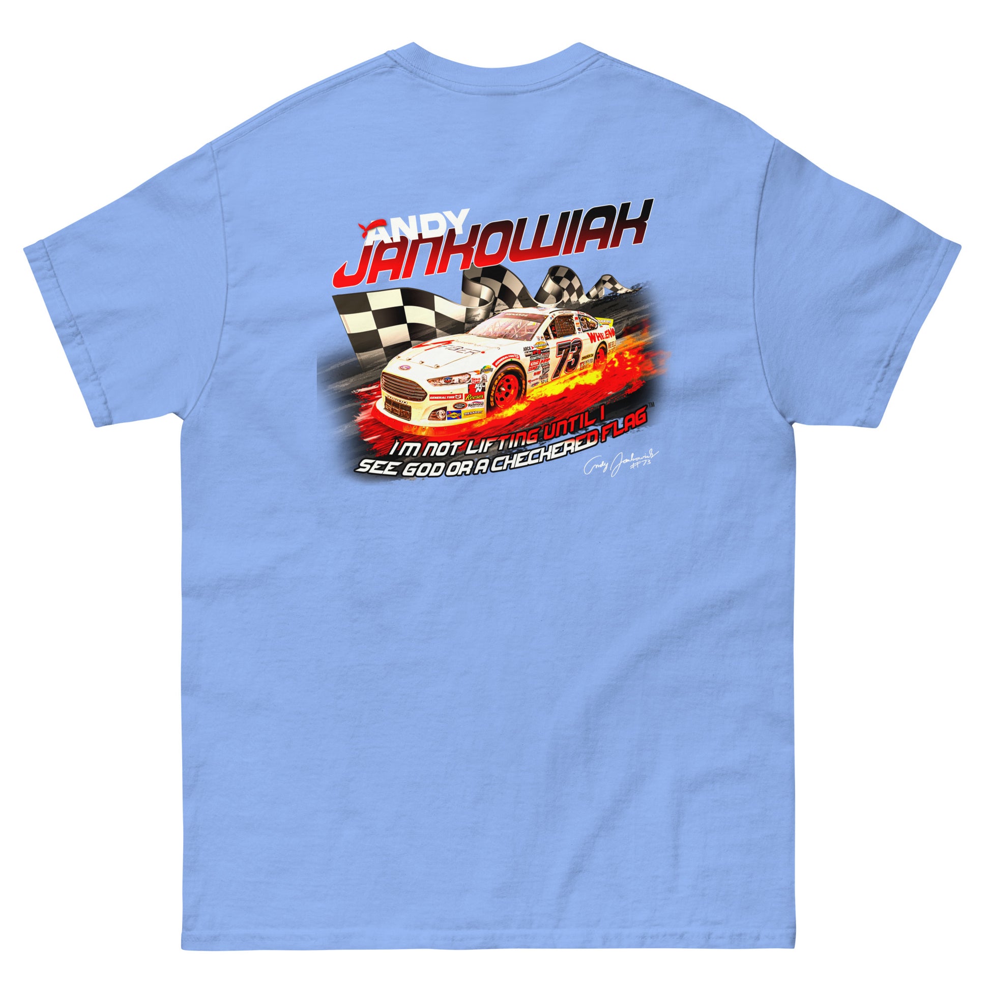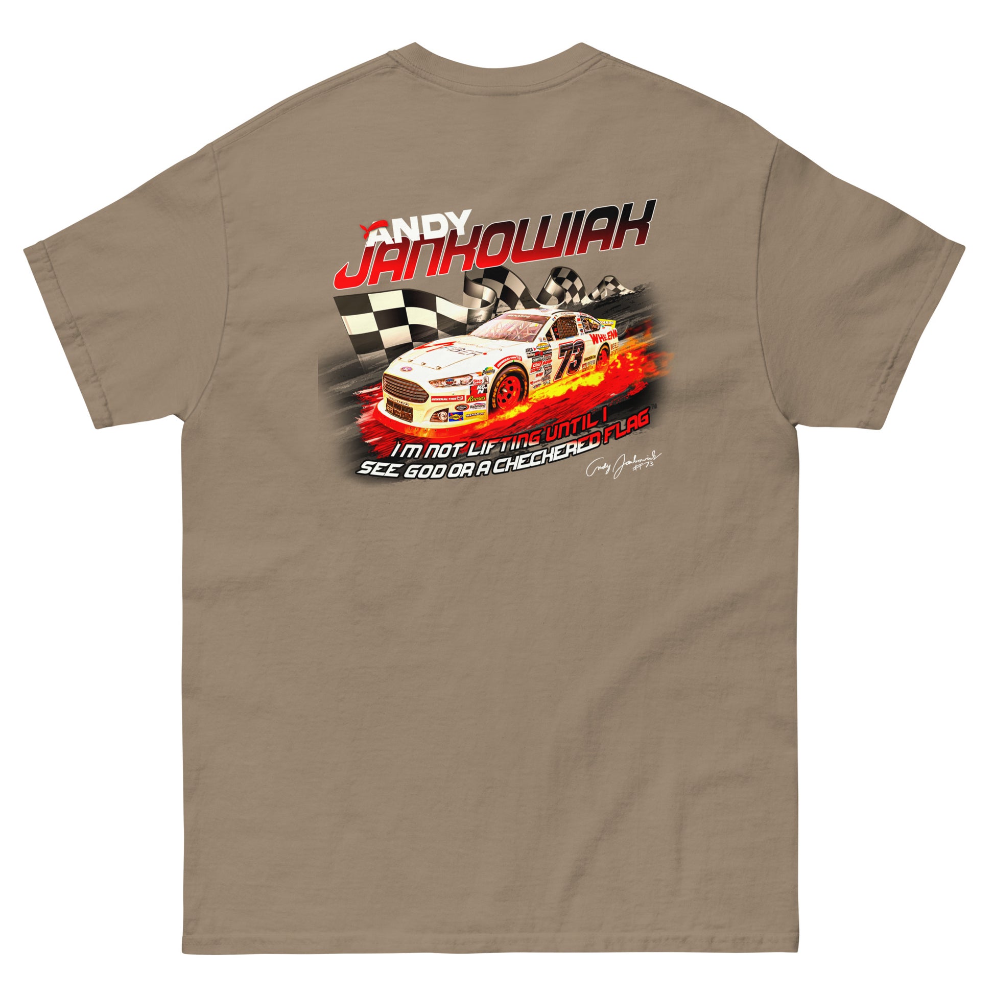 Featuring Andy's iconic quote during the Daytona 2024 race. "I'm not lifting until I see God or the checkered flag"™. The 100% cotton men's classic tee will help you land a more structured look. It sits nicely, maintains sharp lines around the edges, and goes perfectly with layered streetwear outfits. Plus, it's extra trendy now!